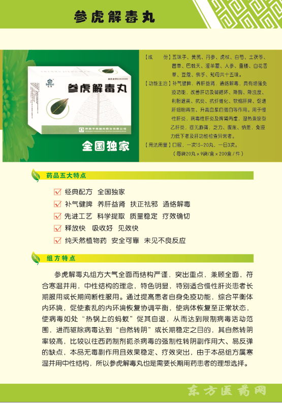 功能主治 | 补气健脾,养肝益肾,通络解毒,具有增强免疫功能,改善肝功及微循环、降酶、将浊度、利胆退黄、抗炎、抗纤维化、软缩肝脾、促进肝细胞再生、升高血浆白蛋白等作用。用于慢性肝炎,病毒性肝炎及脾肾两虚,湿热兼瘀型乙型肝炎,症见胁痛,乏力、腹胀、纳差,免疫力低下者及肝功能检查异常者。 |